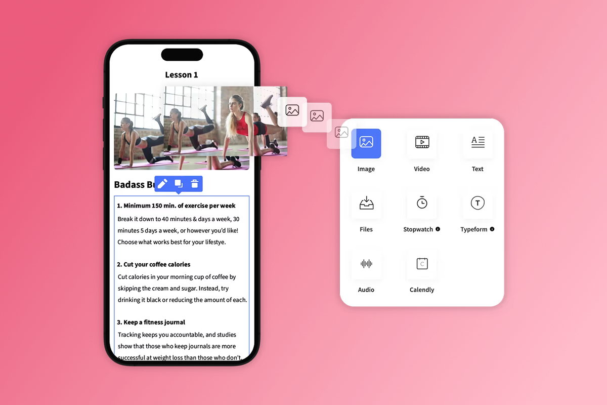 - No-code builder and templates: Drag-and-drop lessons, challenges, habit tracking, and engaging content. Add forms with Typeform and bookings with Calendly.
